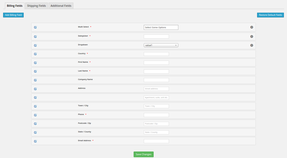 Woocommerce Easy Checkout Field Editor Plugin 允许您在结帐表单中添加/编辑/删除字段。您可以使用我们的拖放管理 UI 重新排序它们。插件支持 15 种广泛使用的自定义字段。您可以选择使用订单电子邮件发送自定义字段数据,并将其显示在管理订单页面上。