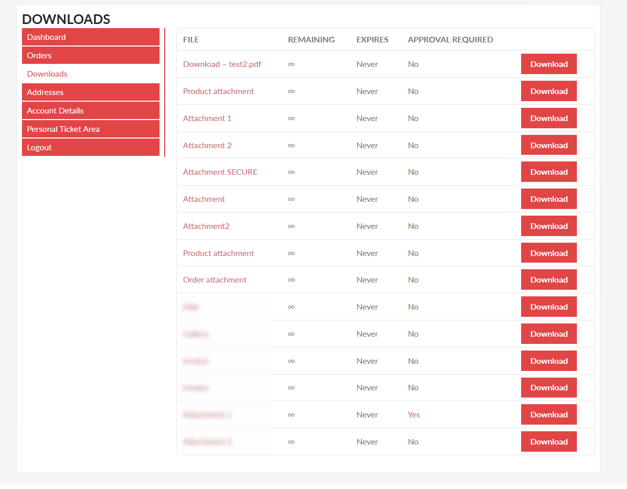 可以选择在“我的帐户”->“下载”选项卡中直接列出和下载订单和产品附件。为此,只需启用常规选项和文本 -> 我的帐户 – 下载部分中的特殊选项。