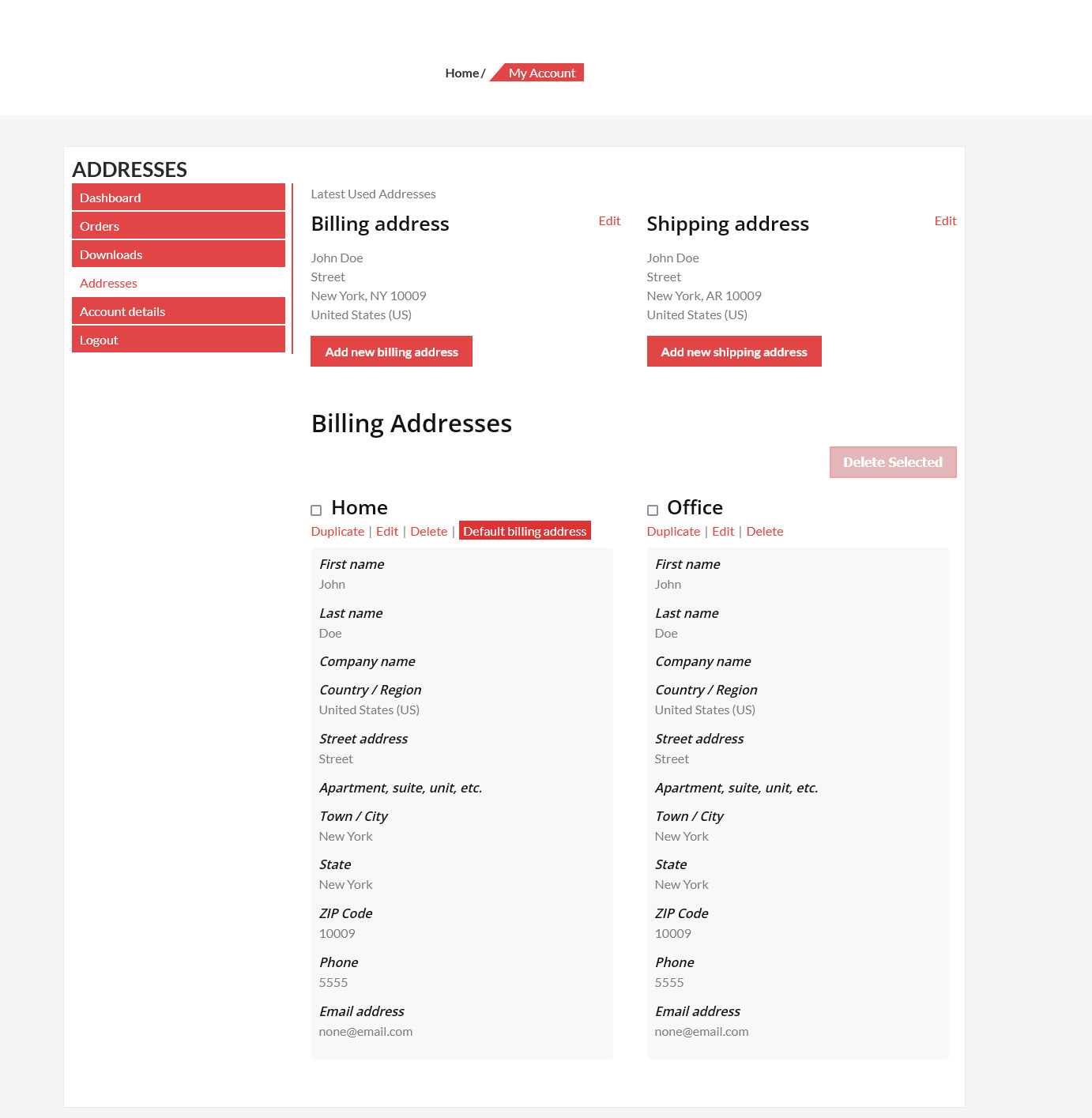 只需访问“我的帐户”页面,每位客户都可以添加、编辑或删除其他帐单和/或送货地址,这些地址稍后可在结帐过程中用作送货或帐单地址。在保存地址之前,插件会对邮政编码(根据所选国家/地区)、电子邮件和电话号码字段执行验证过程。对于每个地址,用户还可以设置默认地址选项,这样标记的地址将自动加载为结帐表格上的帐单/送货地址!