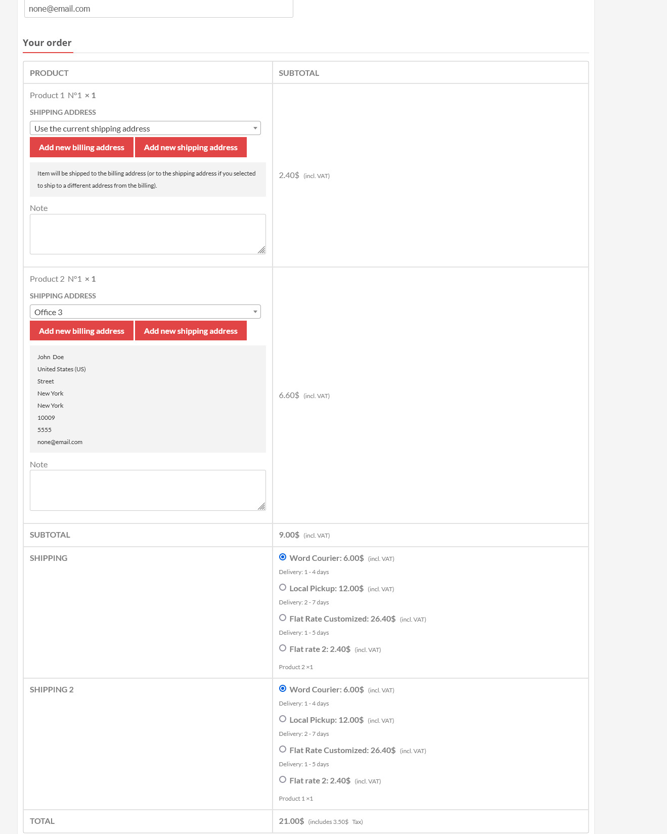 对于运送到与当前结帐送货地址不同的地址的产品,插件可以选择添加额外的手续费。例如: