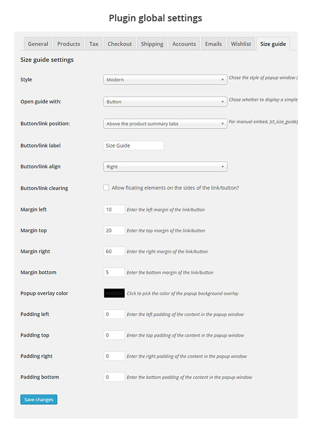 – 功能:禁用每个产品的尺寸指南