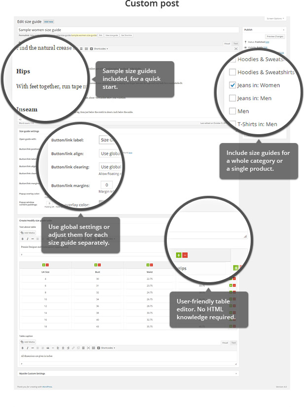 – 功能:尺寸指南内容可以在标签中显示,