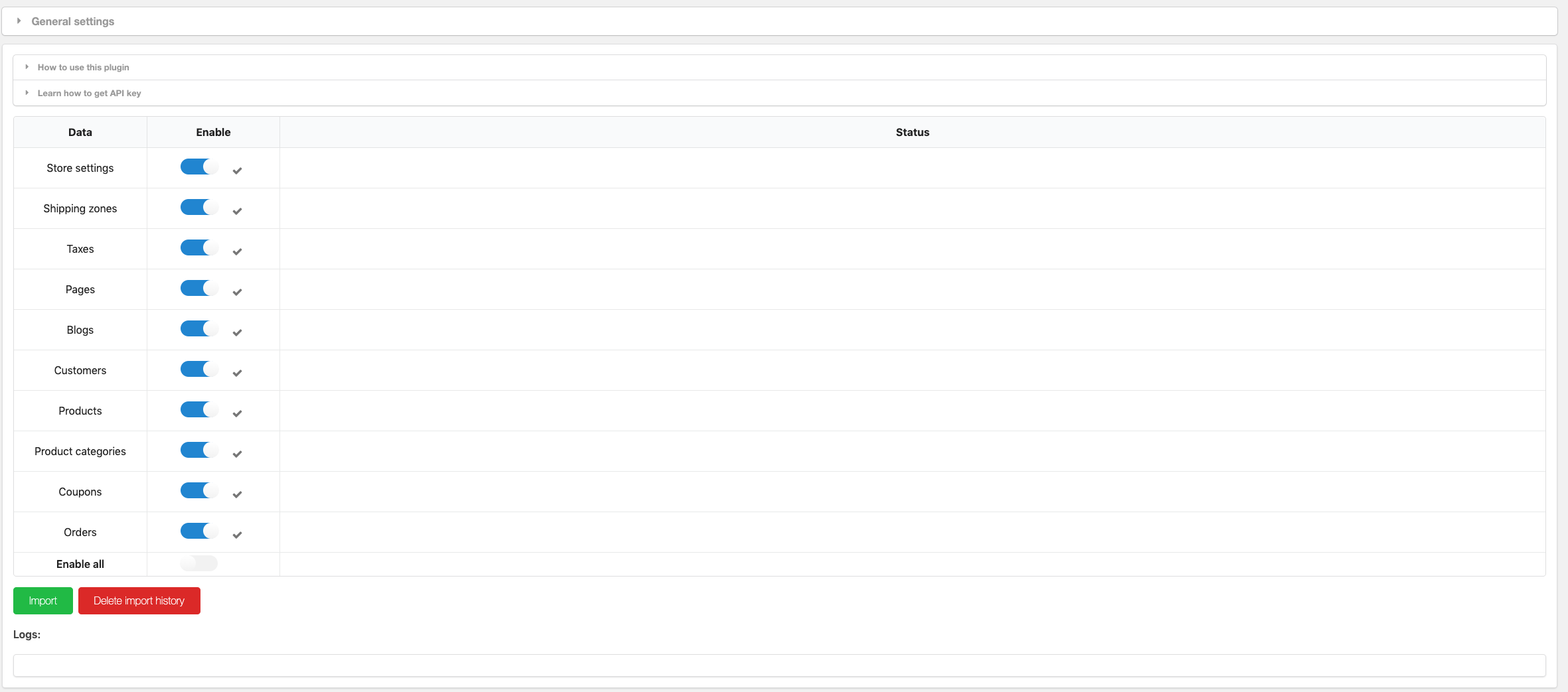您可以选择将 9 种类型的数据从 Shopify 导入到 WooCommerce。包括商店设置、运输区域、税收、页面、博客、优惠券、客户、产品和订单。