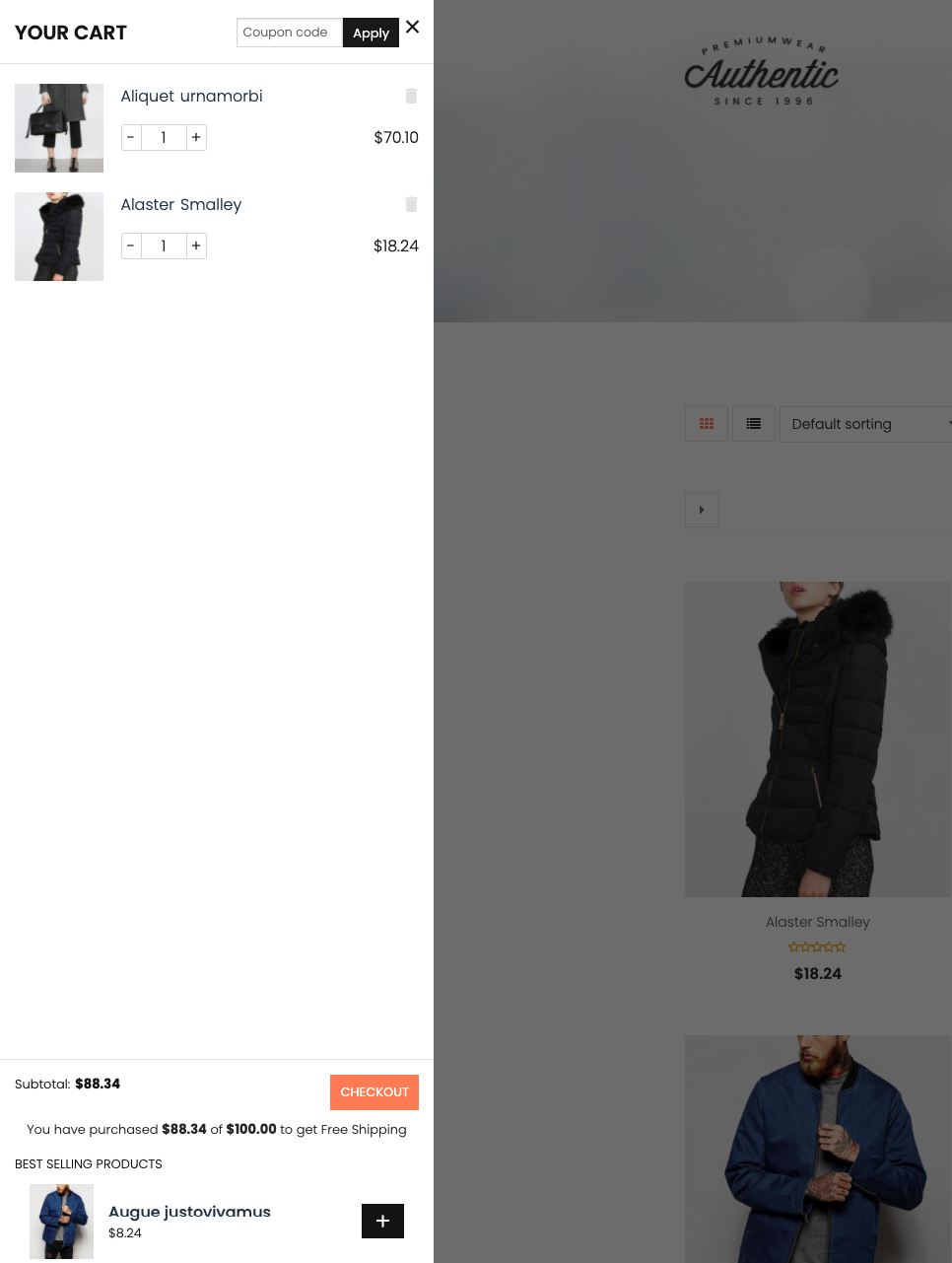 侧边栏购物车:显示带有购物车页面所有功能的侧边栏购物车弹出窗口。客户可以直接在侧边栏购物车上添加优惠券、选择数量、删除商品、结帐。此选项有助于减少结帐时间并提高商店的转化率。