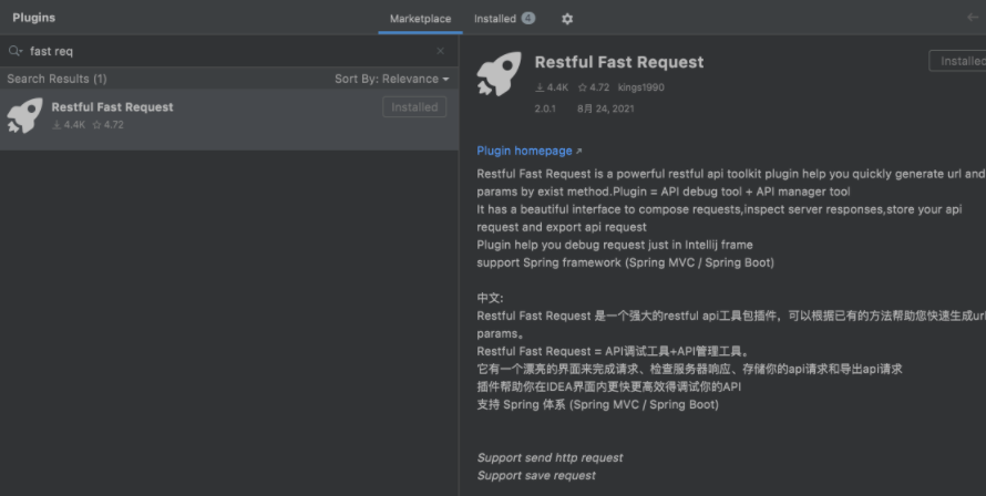 在IDEA插件Plugins中直接搜索Restful Fast Request