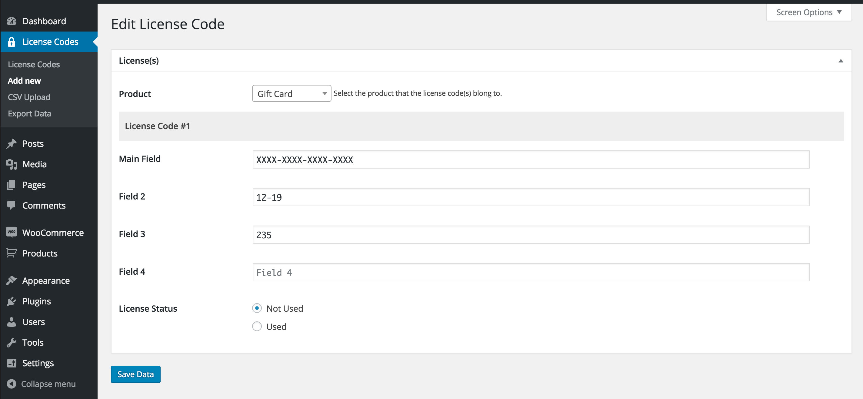 每个许可证代码最多 4 个自定义字段。例如,您的产品可以有“许可证”、“到期数据”、“所有者名称”、“等”