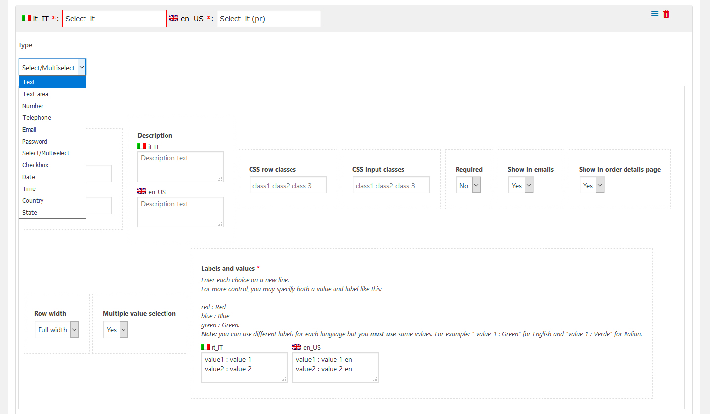 对于每个字段,您可以配置自己的选项,例如分配给输入字段的 CSS 类、占位符文本、在电子邮件上显示、在订单详细信息页面上显示、行大小等。