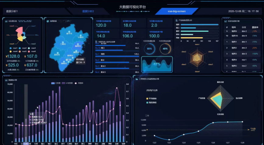 一个基于 vue、datav、Echart 框架的大数据可视化(大屏展示)模板,提供数据动态刷新渲染、屏幕适应、内部图表自由替换、Mixins注入等功能。
