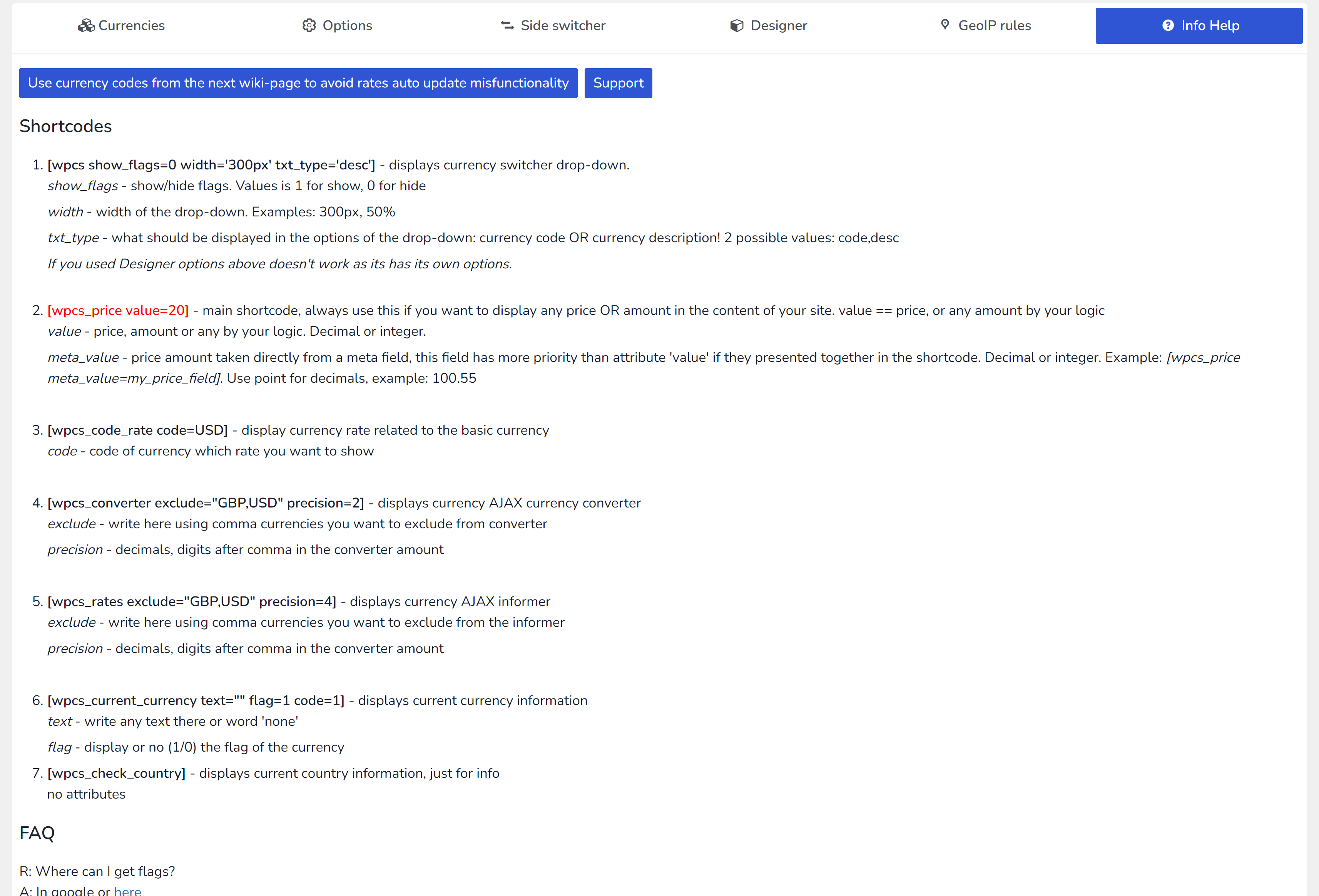 [wpcs_price] – 如果您想为每种货币设置自己的价格并避免相对重新计算基本货币: [wpcs_price type=”fixed” value=”USD:15,EUR:20,GBP:45”] 。如果您想使用元字段而不是属性“值”,请将短代码写为 [wpcs_price meta_value=my_price_field type=”fixed”] 并且元字段的值应具有以下语法:USD:15,EUR:20,GBP:45