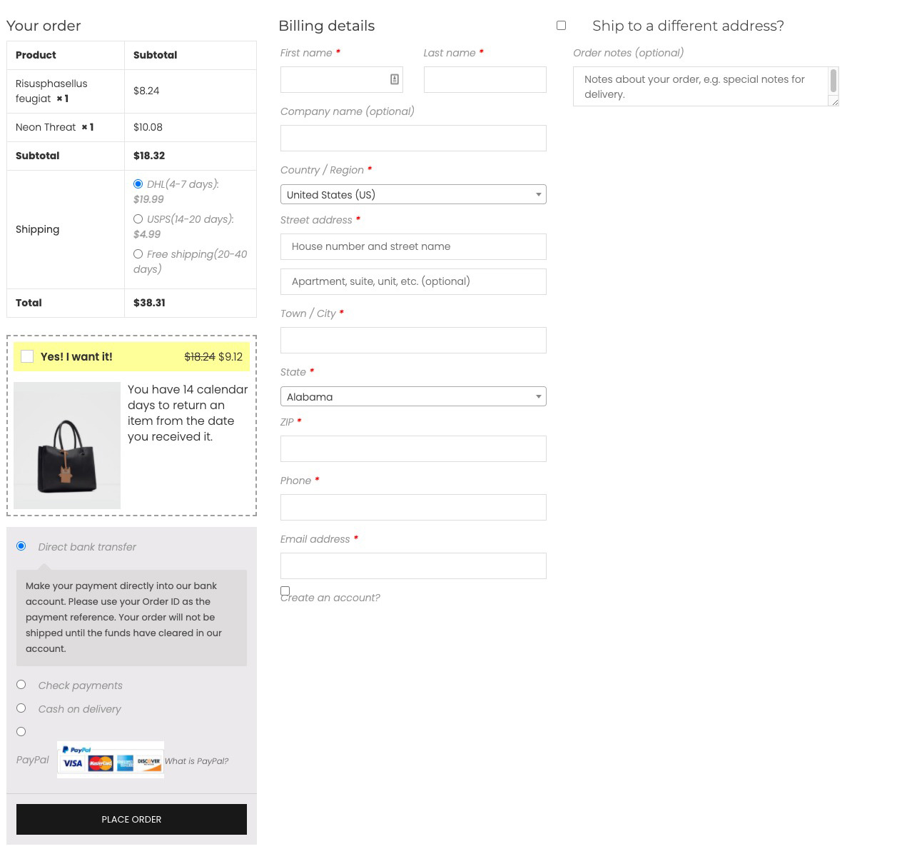 推荐产品:插件会在客户点击“下订单”按钮时建议购买更多产品。您可以从 WooCommerce 上的多种产品在结帐页面上创建建议。