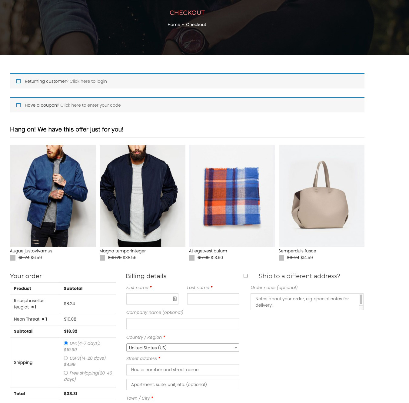 在结账页面:当客户点击下单按钮时,结账页面会出现一个产品建议列表。