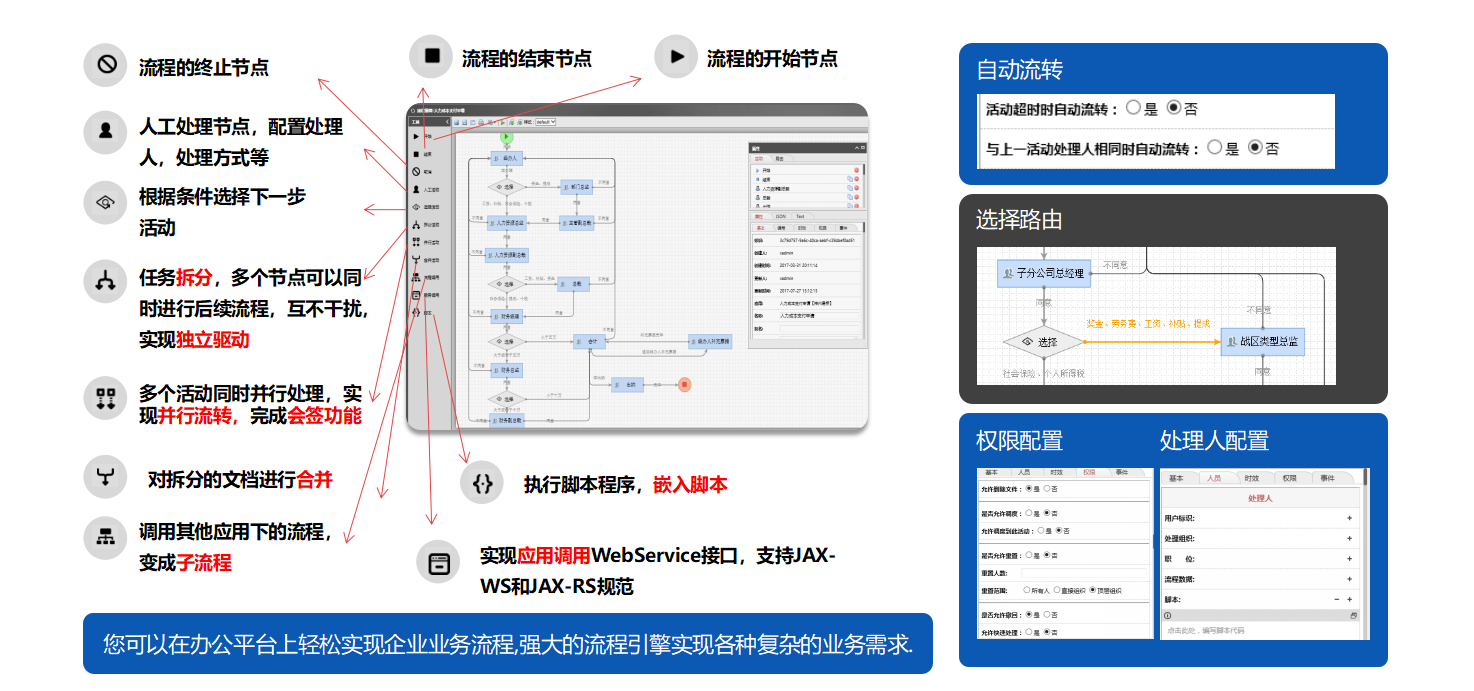 - 流程管理:全功能流程引擎,基于任务驱动,开放式服务驱动,高灵活性、扩展性,事件定义丰富。包含人工、自动、拆分、合并、并行、定时、服务调用、子流程等功能。
