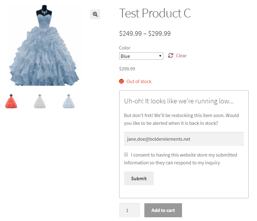 客户注册最适合他们的选项,其中包含三种类型的用户请求警报。将产品标记为“收藏夹”可以让他们在该商品开始销售或库存几乎用完时收到通知。