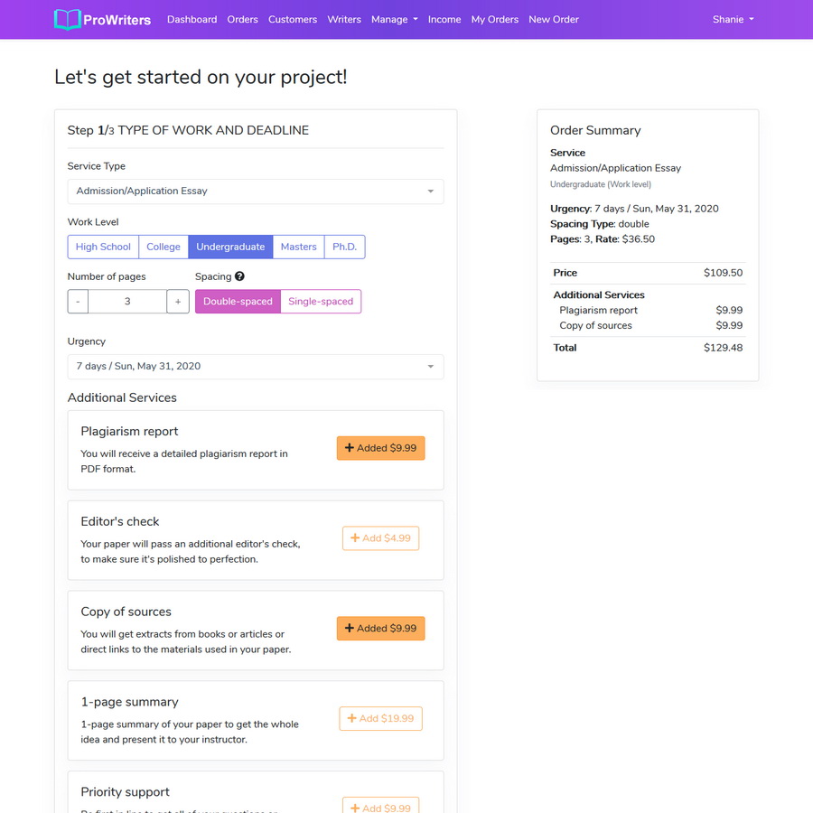 接收来自客户的订单,其中包含有关其要求的详细信息,包括文件附件。收到订单后,系统会自动向您预定义的电子邮件地址发送电子邮件通知。管理您的订单,将它们分配给作家,并通过不同的雕像跟踪它们