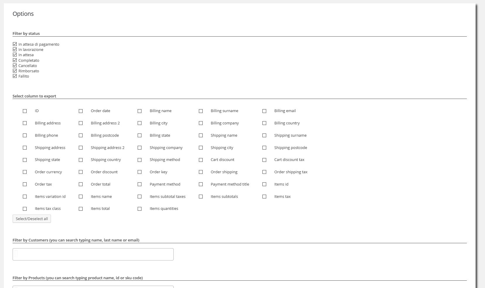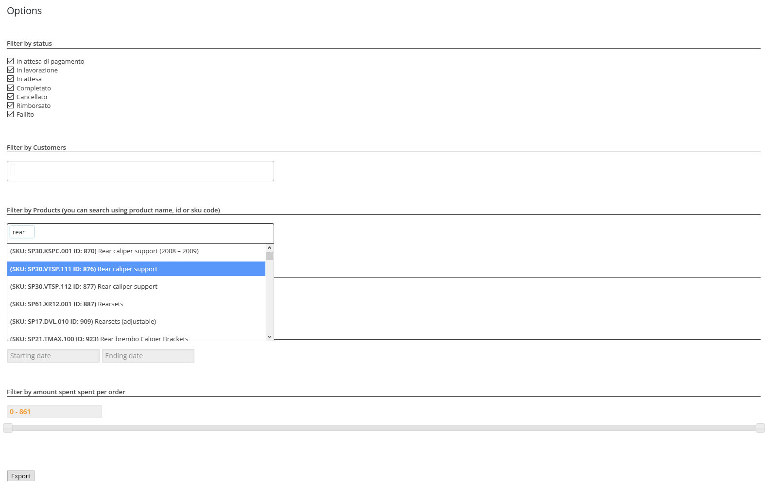 按价格、日期、客户、产品、产品变体、产品类别、订单状态轻松导出您的所有订单或注册客户过滤结果!