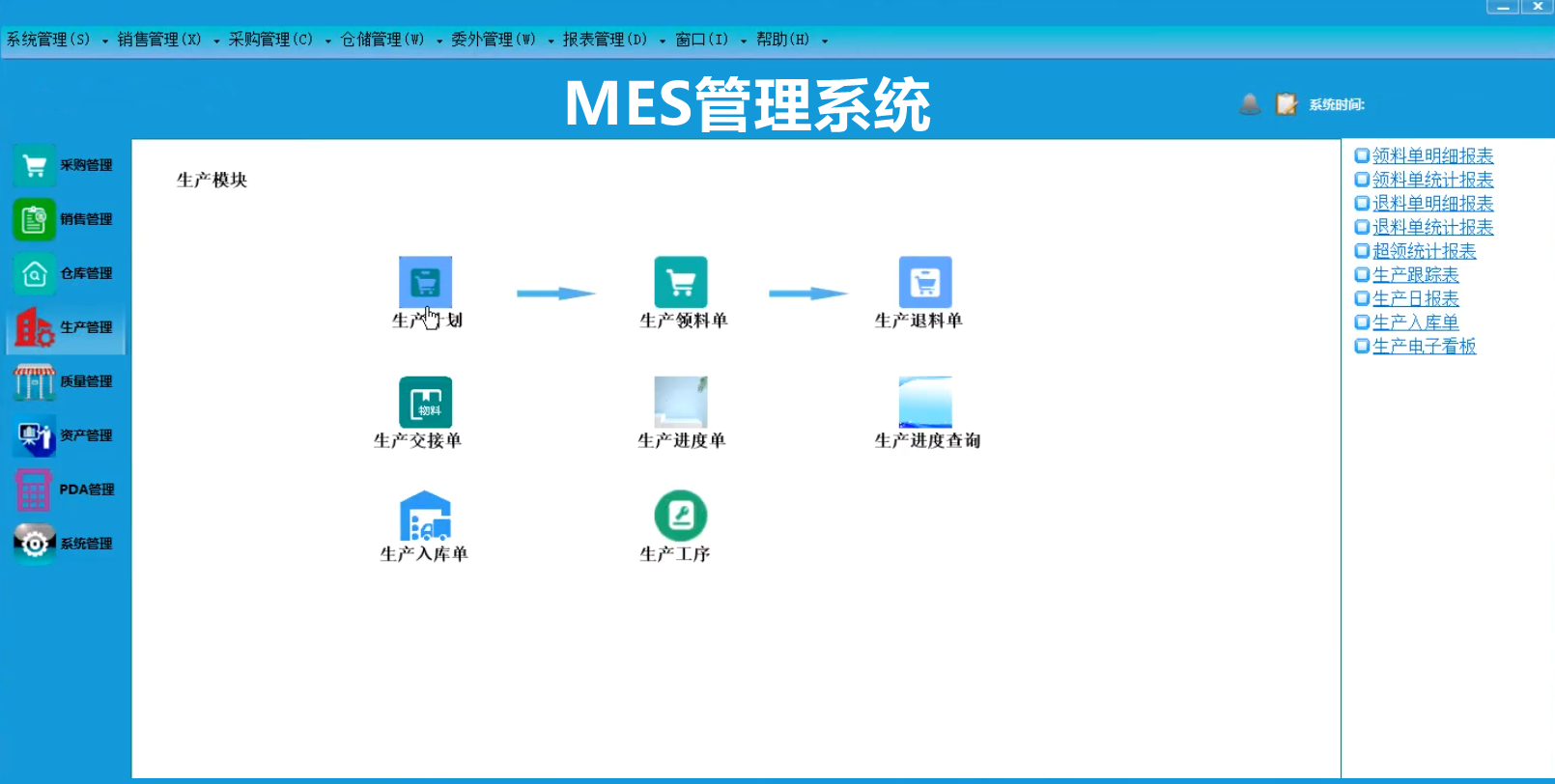 3.生产管理: 生产计划 生产领料单 生产退料单 生产交接单 生产进度单