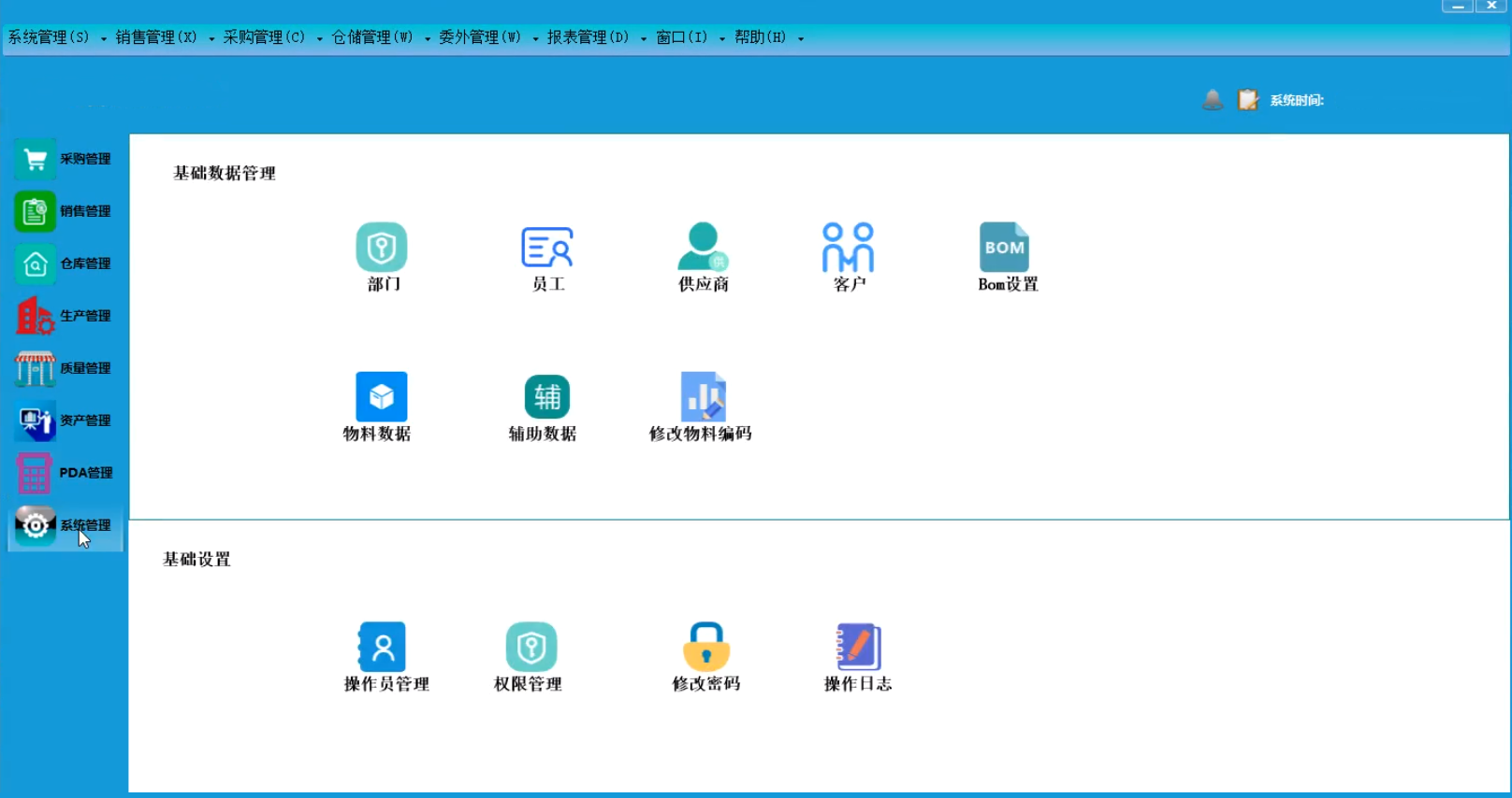 7.系统管理: 部门 员工 供应商 客户 Bom设置 物料数据 辅助数据 修改物料编号