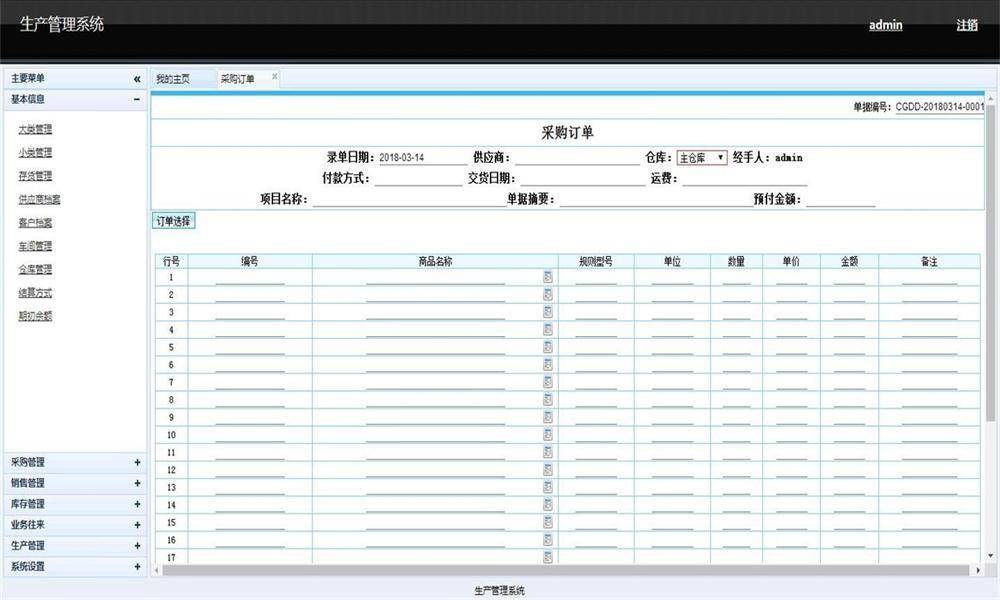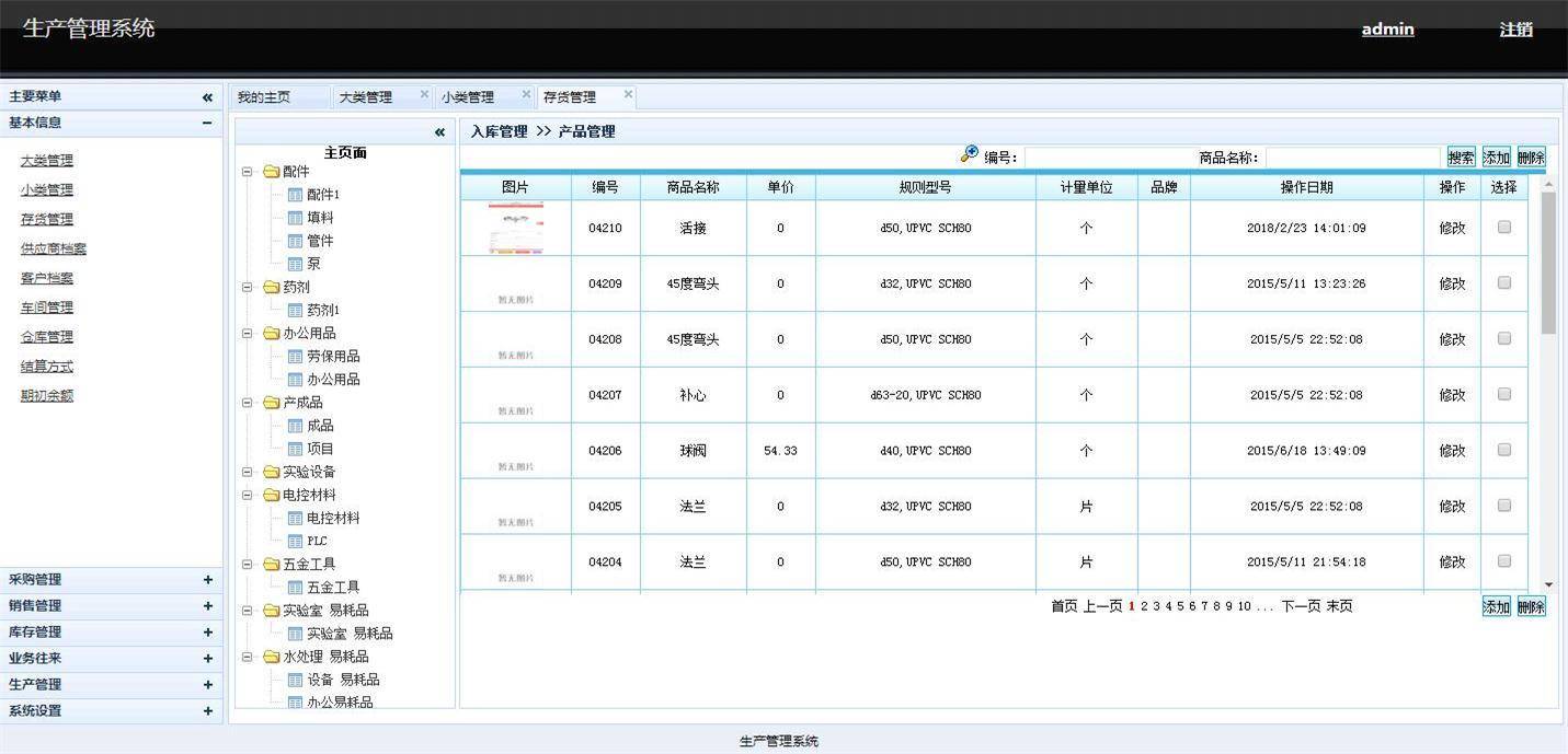 6、生产管理:主要包括生产加工单,生产成品入库单,材料出库单,单据明细,