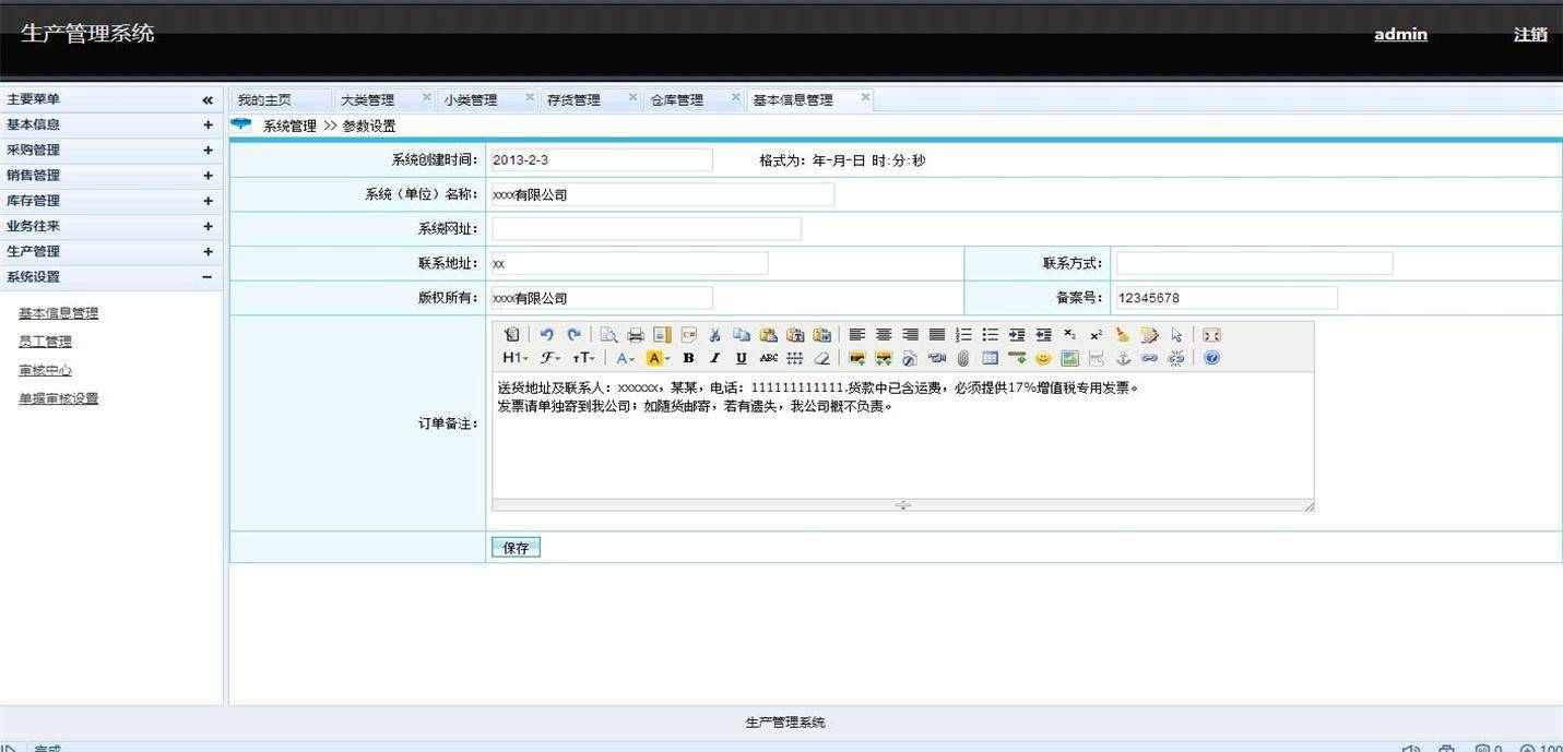 7、系统设置:主要包括基本信息管理,员工管理,审核中心,单据审核设置。