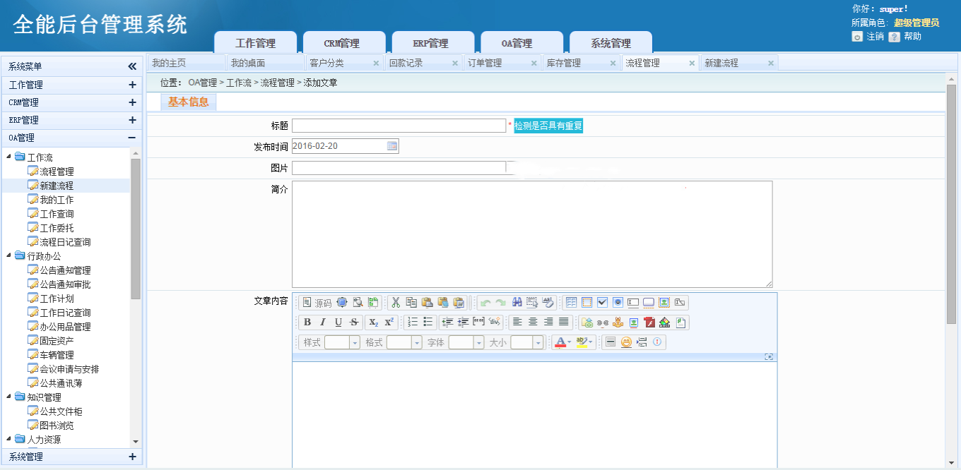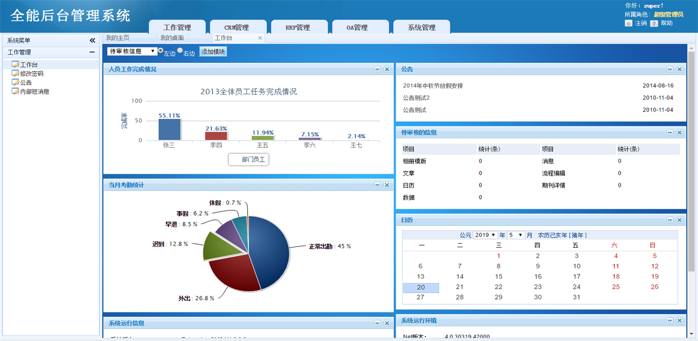 1、功能管理:行政管理、人力资源、工作日志、备忘录、日程安排、个人日记、固定资产、图书浏览、人事管理工作计划、车辆管理(具体菜单功能未实现需要自己开发)。