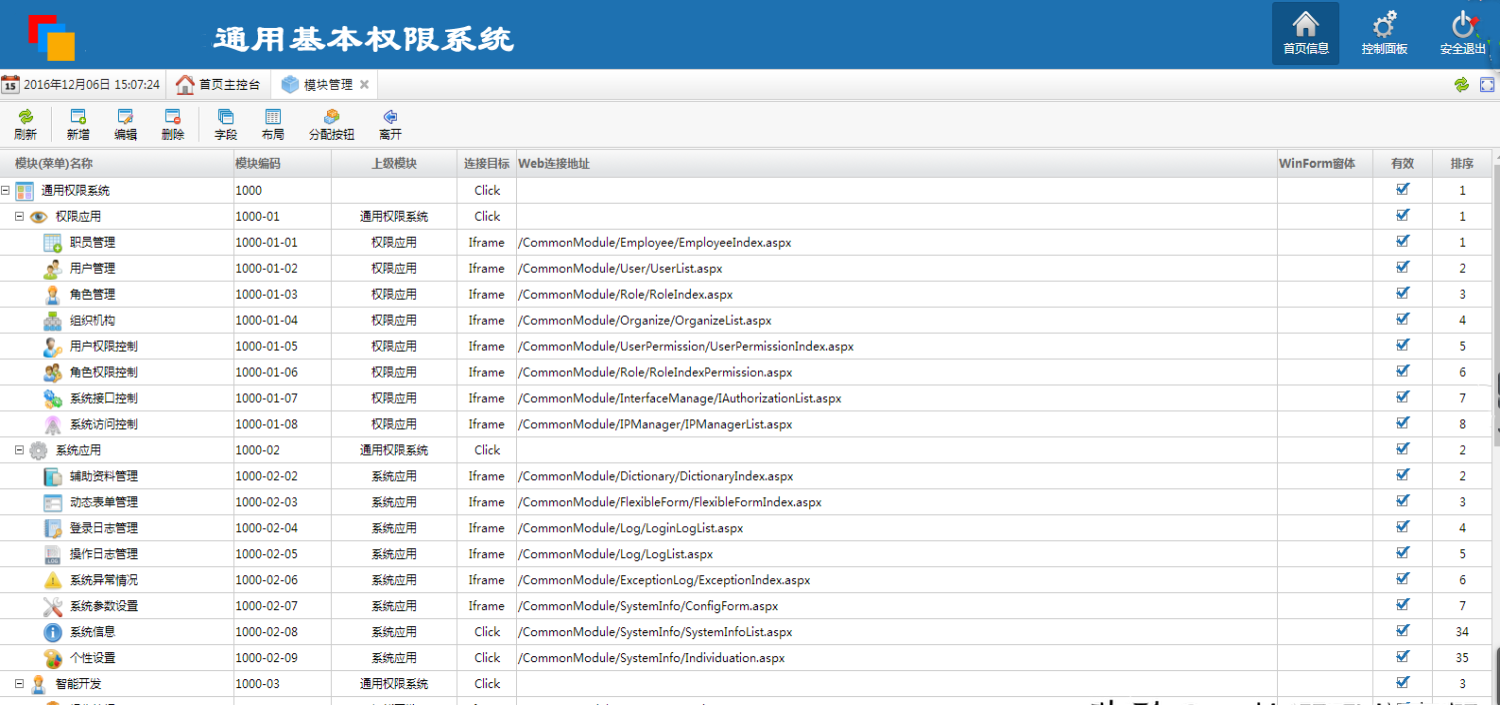 4、模块管理: 菜单功能的管理,可以是系统中的页面,也可以是其它系统的页面地址统一纳入到同一套权限系统中维护。