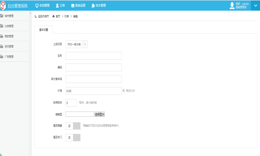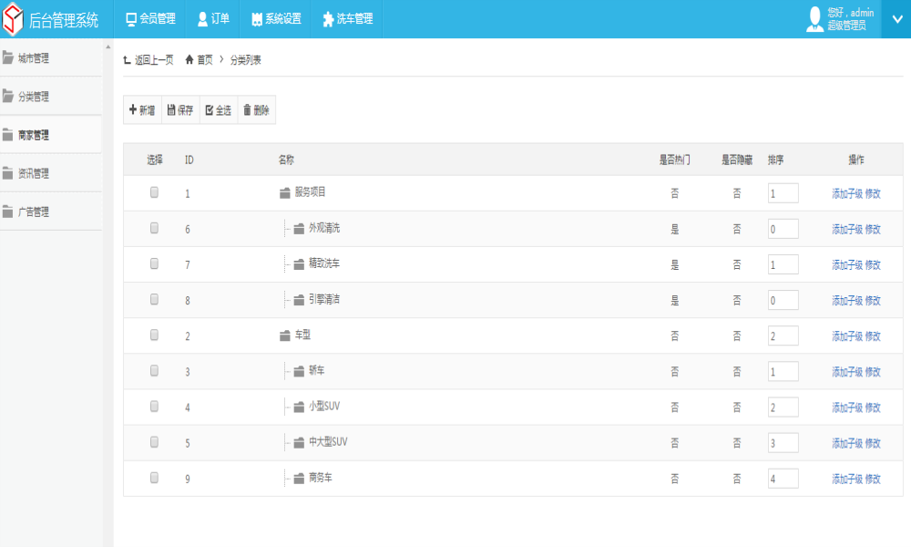 4、洗车管理: 城市管理 、分类管理、 商家管理、资讯管理、广告管理