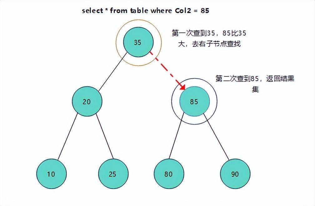 例如,我们通过查询语句查询一条记录:select * from table where Col2 = 85,如果没有索引的话,那么它将从第一行[1,35]开始找,一行一行的找,直到找到[6,85]这条数据,并且数据存放的位置也不规则,拿取一行记录就需要与磁盘进行一次交互,即IO读取,如果数据多,这种效率将会很低下,只要把这种交互次数控制在一定范围之内,那他的效率将会比一行行查找要高很多,如给col2加索引,来执行select * from table where Col2 = 85,通过二叉树接口,第一次我们查到的是35,85比35大,所以查找右子节点,查到85,与条件种的85为一条数据,所以,这里就只需要两次交互就可以查到。所以索引就诞生了。