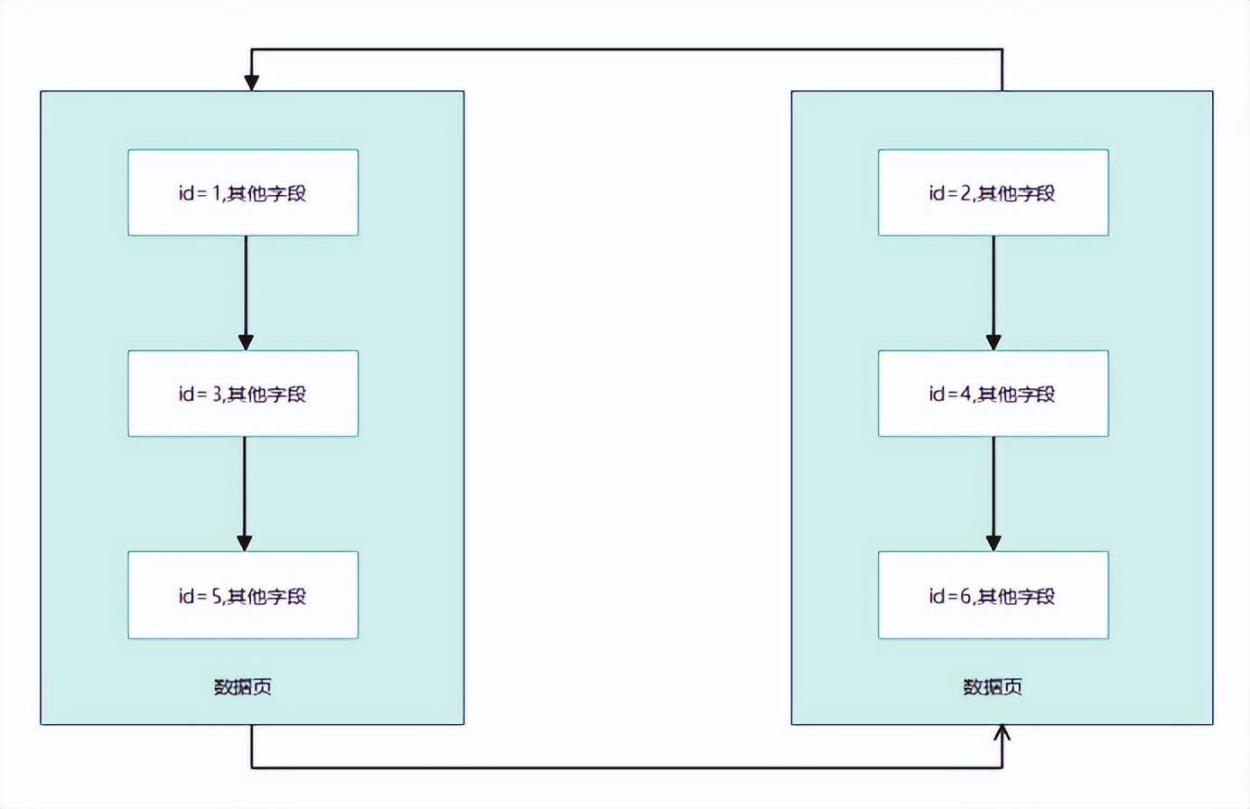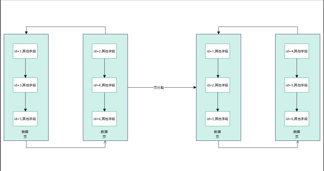 上面就是数据也的结构了,两个数据页之间会有指针指向上一个和下一个数据页,形成一个双向链表,(也就是InnoDB中B+Tree的叶子节点)在数据页中存储的就是一行行数据了,每个数据行之间会有单向指针连接,组成一个单向链表,假设你不停的往表里插数据,那么刚开始就会在一个数据页里面插入数据,比如说我们在左侧的数据页中插入数据,先插入主键id为1,3,5的数据,数据越来越多,我们就要搞另外一个数据页,这个数据页里面我们就插入了主键id为2,4,6的数据,关键点来了,当我们使用索引的时候,最基本的条件就是后面数据页中的数据行主键值要都大于前一个数据页中数据行的主键值,所以,当我们发现后一个主键id要小于前一页的主键id值,我们就要进行数据挪动,从而满足索引的基本要求,这个过程就是页分裂如下图所示: