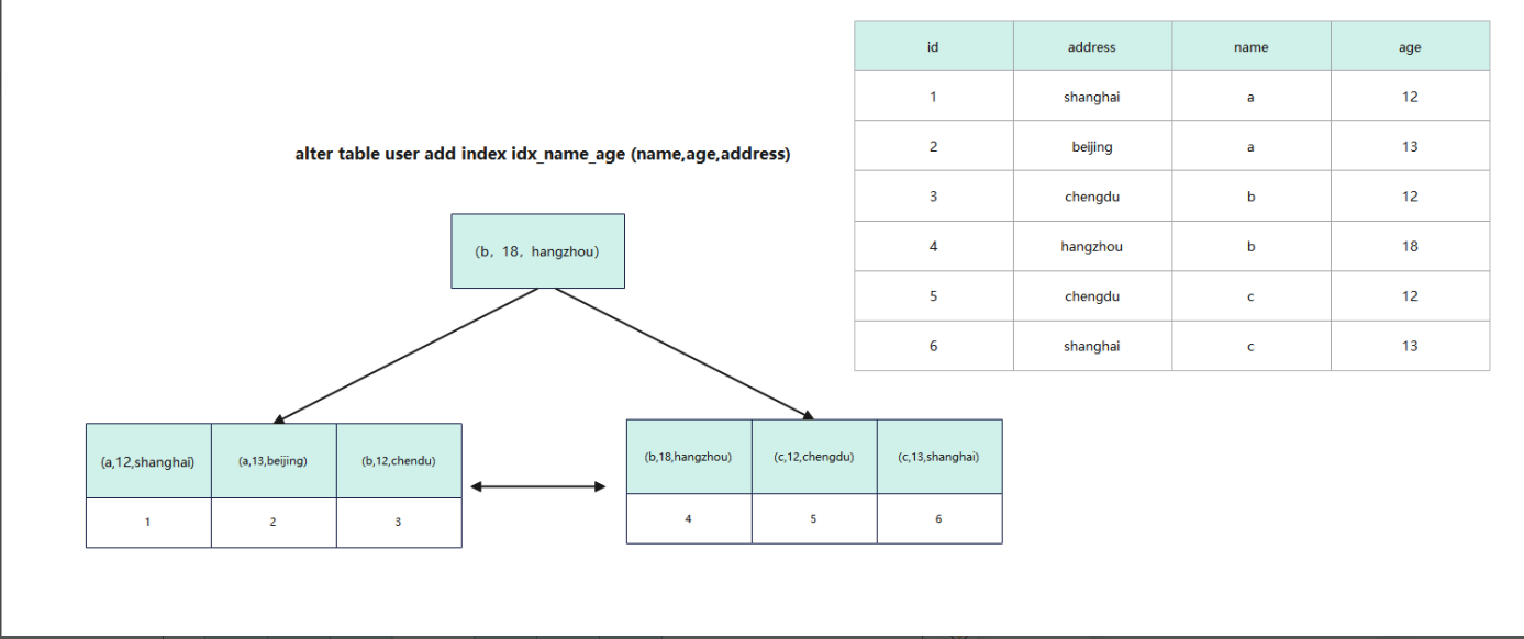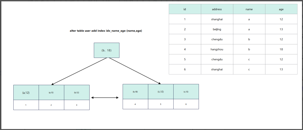 假设我们有id(主键),age,adderss,name这四个字段,且age,name两列为联合索引的两个列