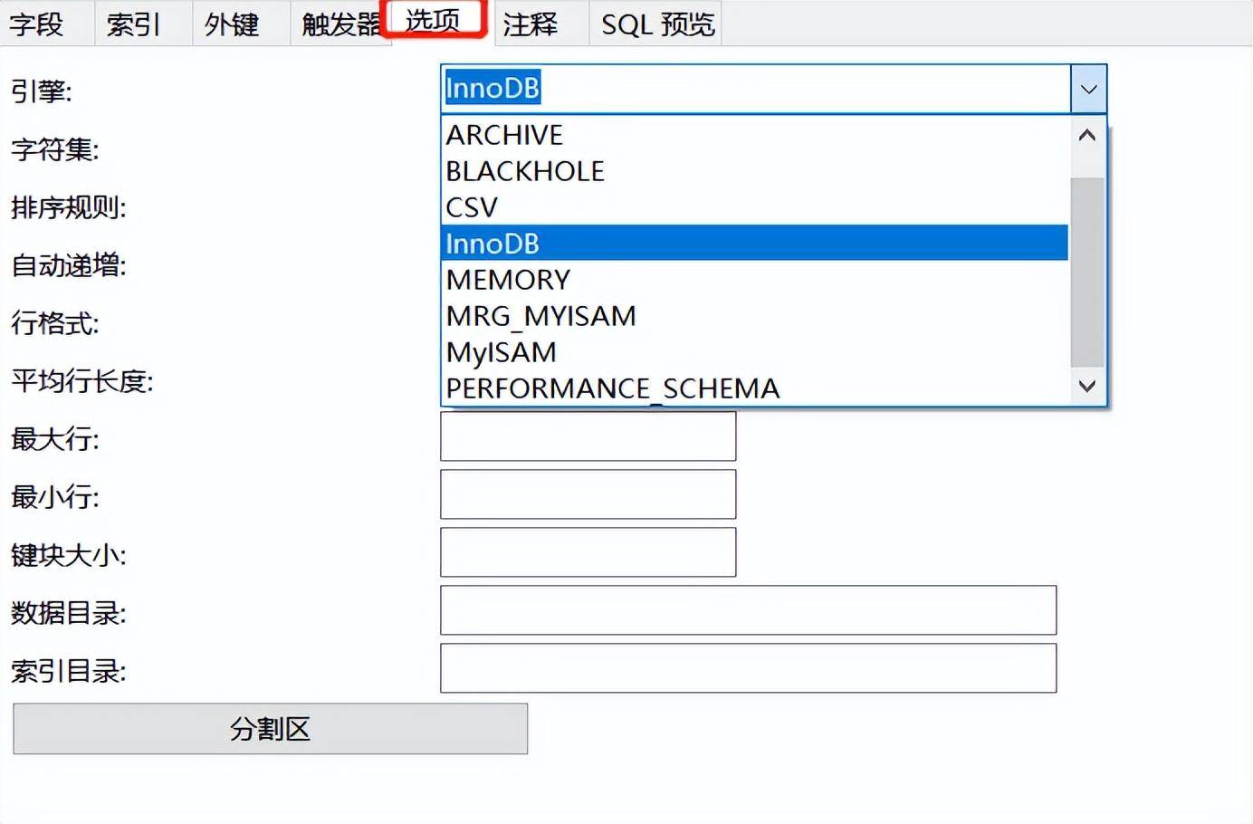 数据存储引擎是形容数据库表层面的,而不是形容数据库的,我们点击表设计,在选项中证实这一问题。