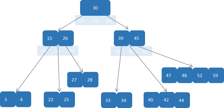 首先获取关键点的关键字进行比较,当前根节点关键字为30,42>30,所以找右子节点,拿到关键字39,45,39<42<45,所以直接找到39和45的中间的节点,拿到40,42,44,因为42=42,所以直接返回关键字和指针信息(如果树结构中没有包含所要查找的节点则返回null)