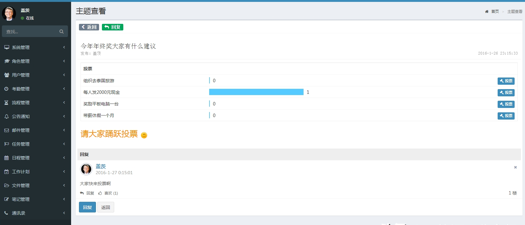 6.本系统功能丰富,主要包括:系统管理、角色管理、用户管理、考勤管理、流程管理、公告通知、邮件管理、任务管理、日程管理、工作计划、文件管理、笔记管理、通讯录、讨论区、便签等等,还有多种颜色皮肤可以切换。