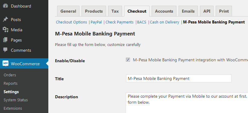 转到 WooCommerce > 设置 > 结帐 > “M-Pesa 移动银行支付”并设置您必要的自定义。