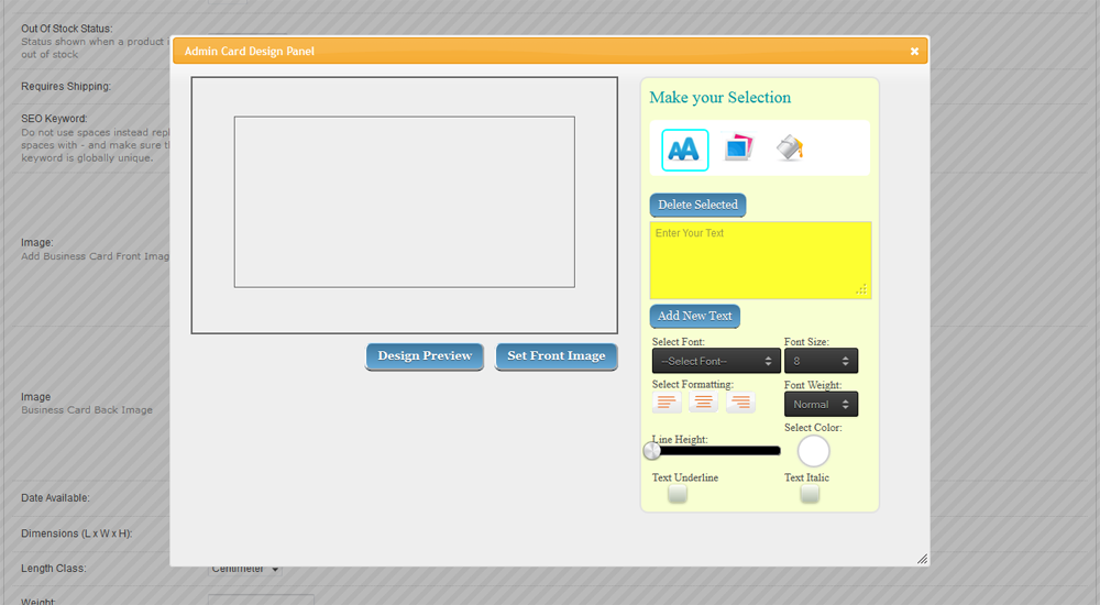 “OpenCart 的自定义名片设计”模块是一个用于设计或定制名片的开放式购物车模块。通过此模块,客户可以根据自己的需要设计名片,例如通过不同类型的颜色、字体、大小和格式添加姓名、名称、地址、联系方式、徽标和图像。用户还可以通过弹出窗口的变化选项更改名片的背景并添加到购物车。用户可以上传多个图像并将图像和文本拖动到不同的位置。