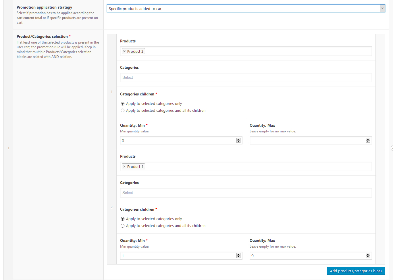 选择特定产品策略,您可以选择一组产品和/或类别。如果购物车将包含至少一个选定的项目,促销将被应用。您可以选择使用最小值/最大值指定自定义数量范围。