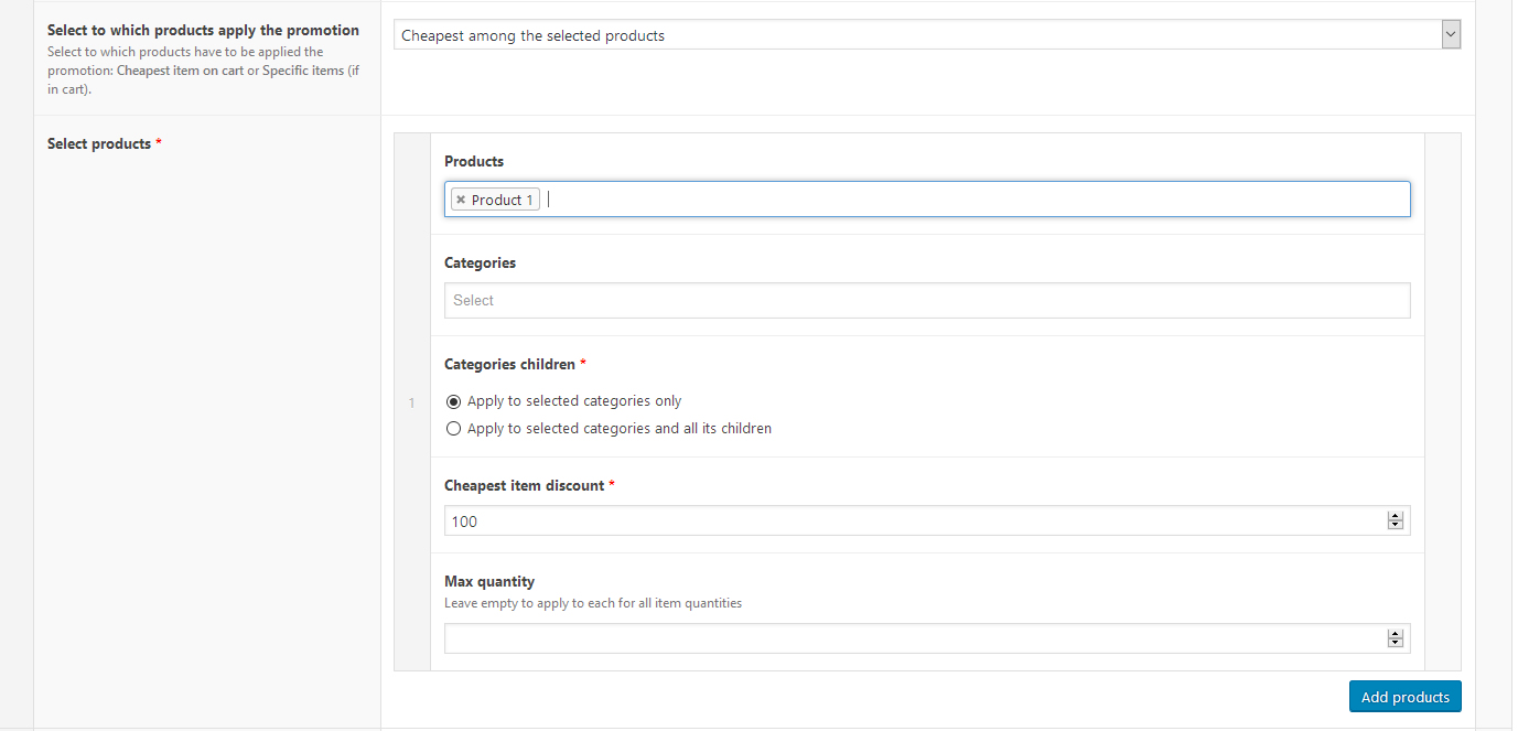 下一步是选择应用促销的项目。它可以是购物车上最便宜/最贵的商品,也可以是所选产品中最便宜/最贵的商品。选择第一个选项,插件将自动检测当前购物车中最便宜/最贵的产品,并根据设置的最便宜/最贵产品折扣百分比值应用折扣。如果购物车中有多个该商品的数量,您可以选择应用折扣值的商品数量。也可以选择设置购物车总数:最小值/最大值。这意味着只有当购物车总数包含在该价值范围内时,才会应用促销活动。 所选产品中最便宜/最贵的选项允许您仅将促销应用于所选产品/类别中最便宜/最贵的产品。您可以添加多个产品“块”,每个产品都可以有自己的最大数量值。最大数量值是将应用折扣的最大项目数。