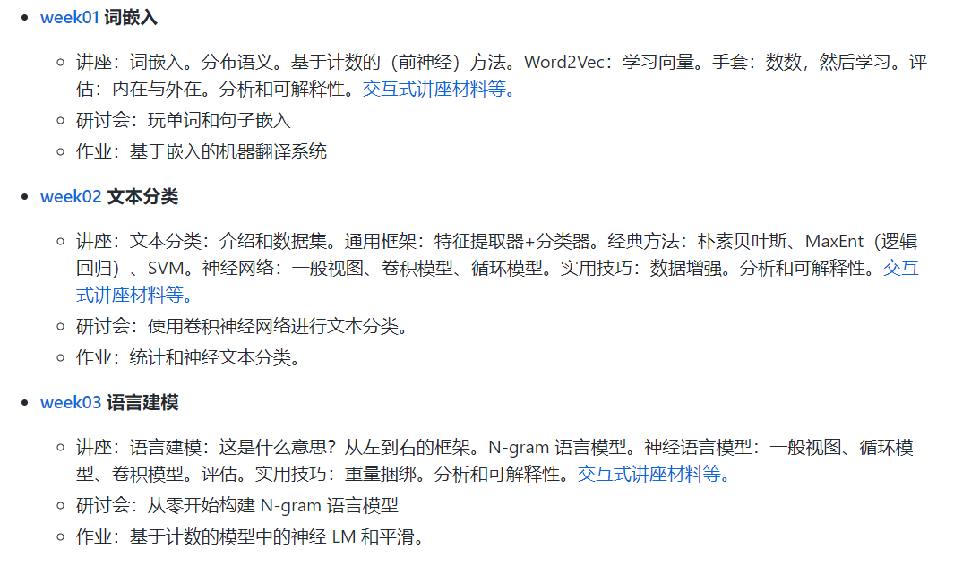 在这套NLP课程中,作者们把这套课程拆分成了13周,从文本嵌入分类开始讲,到Seq2Seq,再到机器翻译、对话系统,内容丰富。