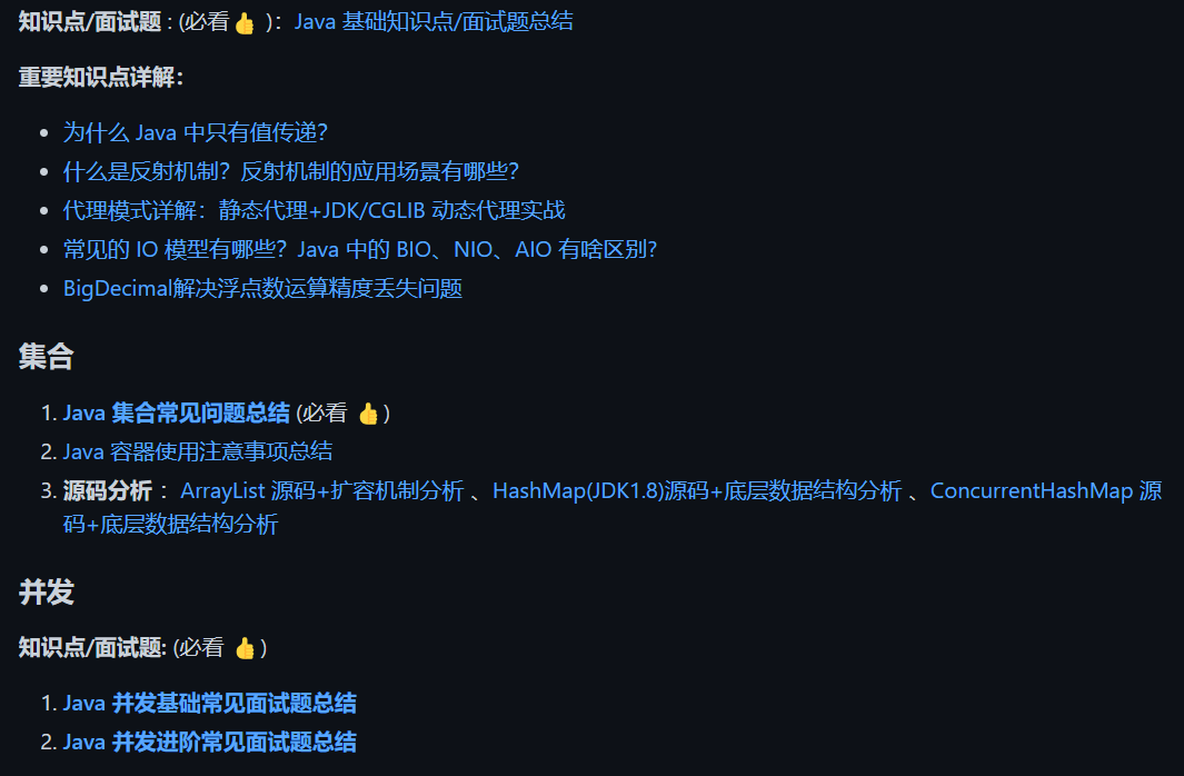 「Java学习+面试指南」一份涵盖大部分 Java 程序员所需要掌握的核心知识项目。JavaGuide (opens new window)目前已经是 Java 领域 star 数量最多的几个项目之一,登顶过很多次 Github Trending。