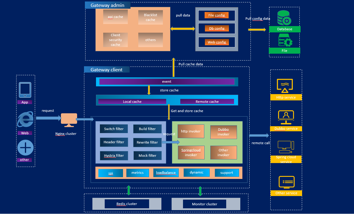 - 系统具备安全验证、黑名单、验签、限流、url重写、熔断、mock、header、系统开关等常用过滤器;具备http、dubbo、spring cloud、websocket等类型rpc转发功能
