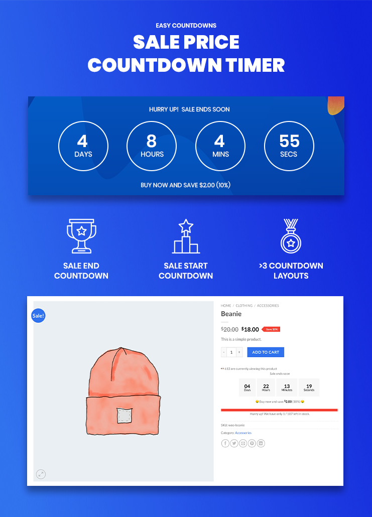 我们的插件不仅支持销售倒计时,还可以让您完全控制它们。在多种布局之间进行选择,显示销售结束或开始倒计时,并轻松决定要在哪里显示。