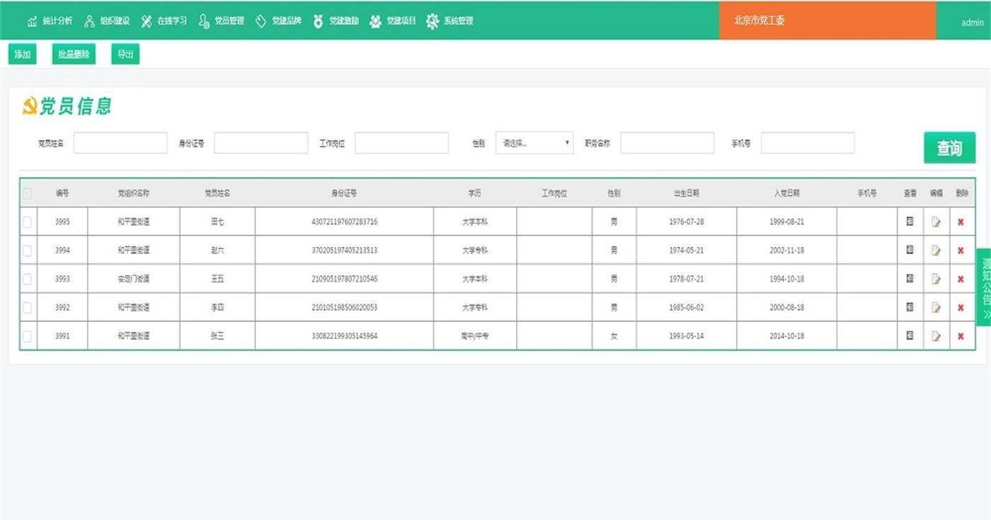 党员管理系统可以对党员的基本信息进行管理、党费缴纳管理、党员活动管理、党建地图、党组织概况管理,信息公开管理,在线学习管理,统计分析等功能。系统具有完整的源码和数据库。