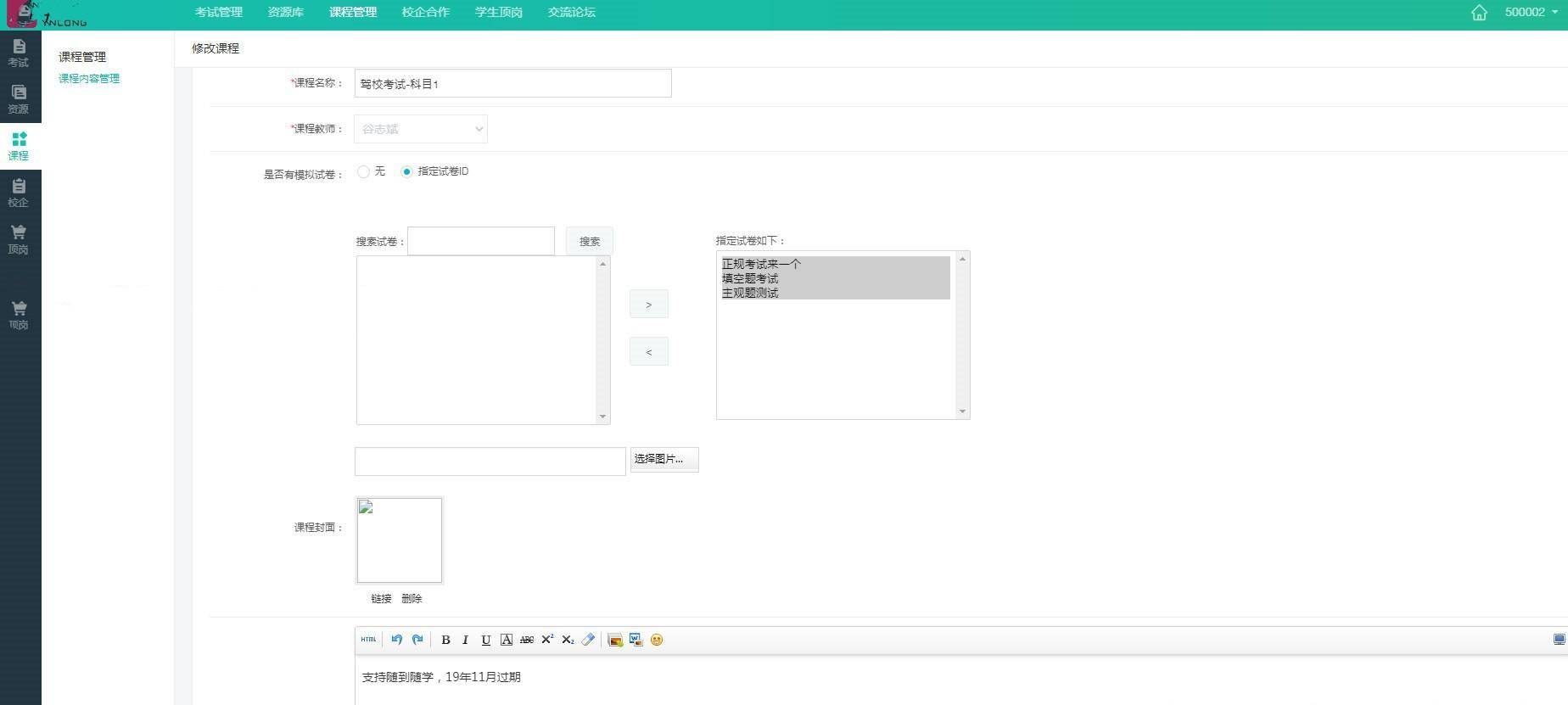 对整个课程添加课后练习有两种入口方式: 在添加课程时,直接捆绑试卷;点相关管理下“试卷”进入添加。