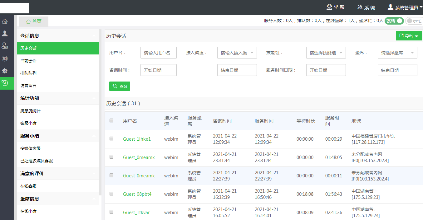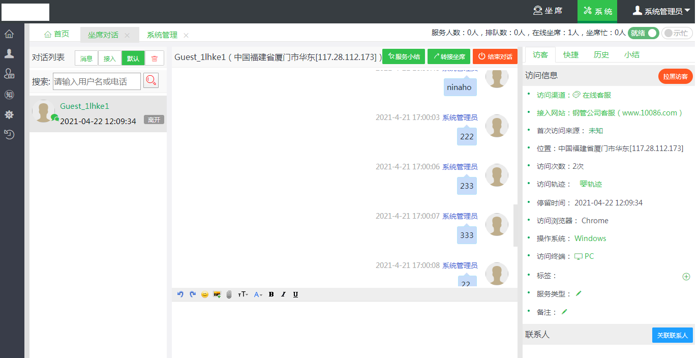 坐席对话(对话聊天窗口、转接对话、结束对话、服务小结)、访客信息、拉黑访客