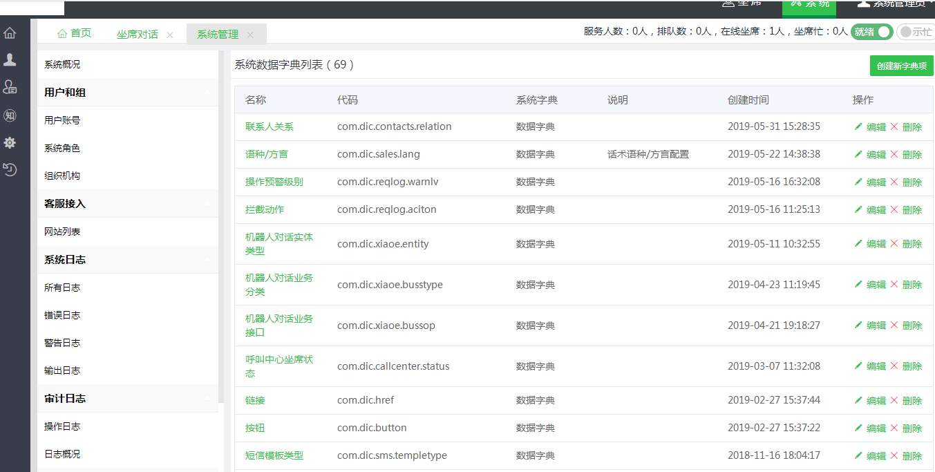 系统设置(系统概况 用户和组 用户账号 系统角色 组织机构 客服接入