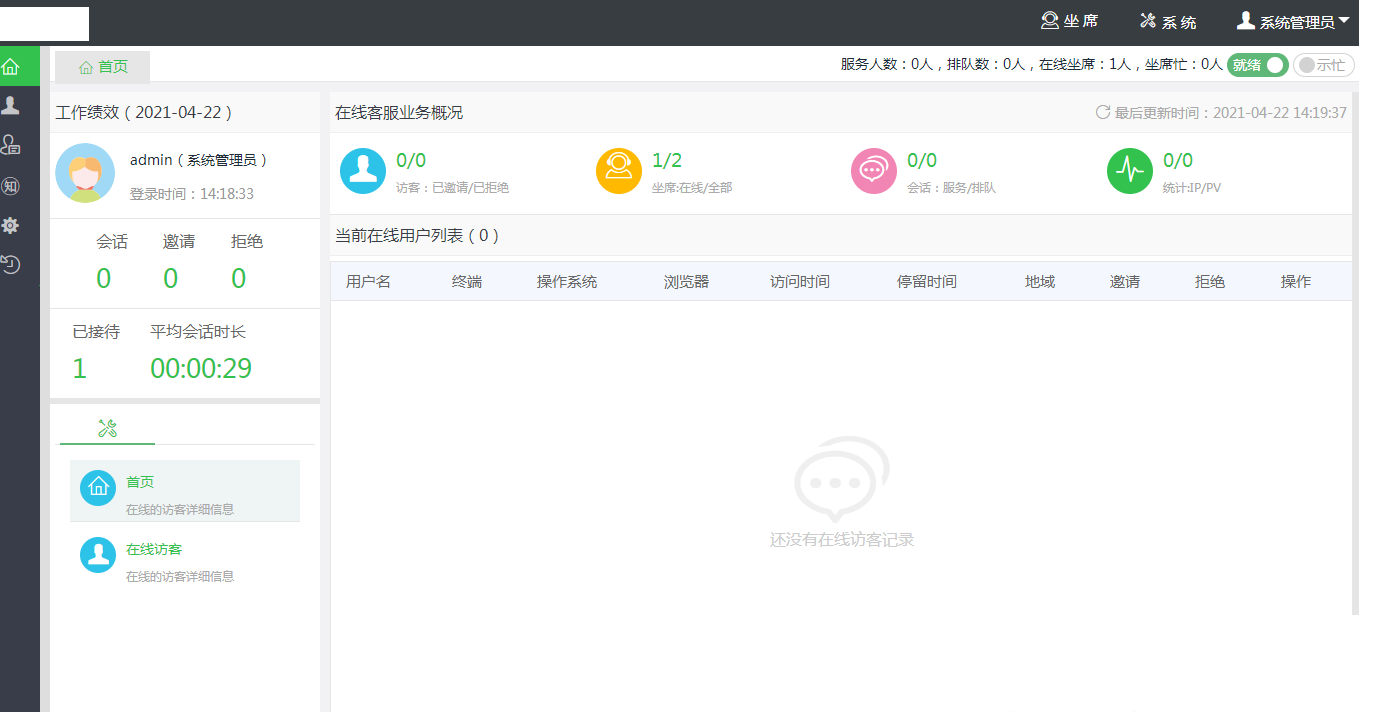 首页-在线客服业务概况(访客:已邀请/已拒绝、坐席:在线/全部、会话:服务/排队、统计:IP/PV)数实时统计