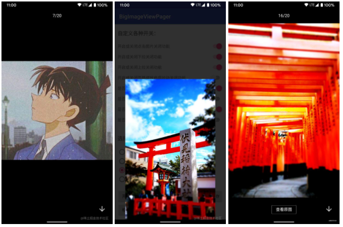 一个图片浏览器,支持超大图、超长图、支持手势放大、支持查看原图、下载、加载百分比进度显示。采用区块复用加载,优化内存占用,有效避免OOM。支持手势下拉退出,现已支持androidx。
