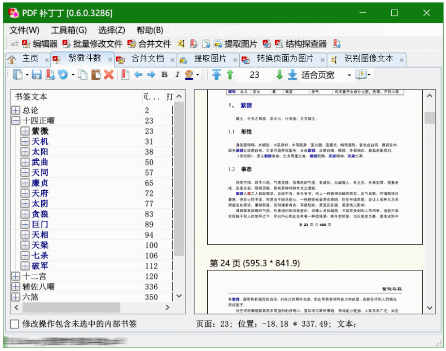 PDF补丁丁是一个多功能的 PDF 文档工具箱,在 2009 年开始,我开始了该程序的开发,到现在也已经有十二年了。它致力于解除 PDF 文档的烦恼,带有一个强大的 PDF 书签编辑器(可自动生成书签),有超快的从 PDF 文档里无损提取图片的能力,又可以合并图片和 PDF 文档,统一页面尺寸,清除文档的打印和复制限制,这些功能都是这些年来一直为用户所喜爱的。对于高端开发者,又提供了文档结构探查器等一系列功能。