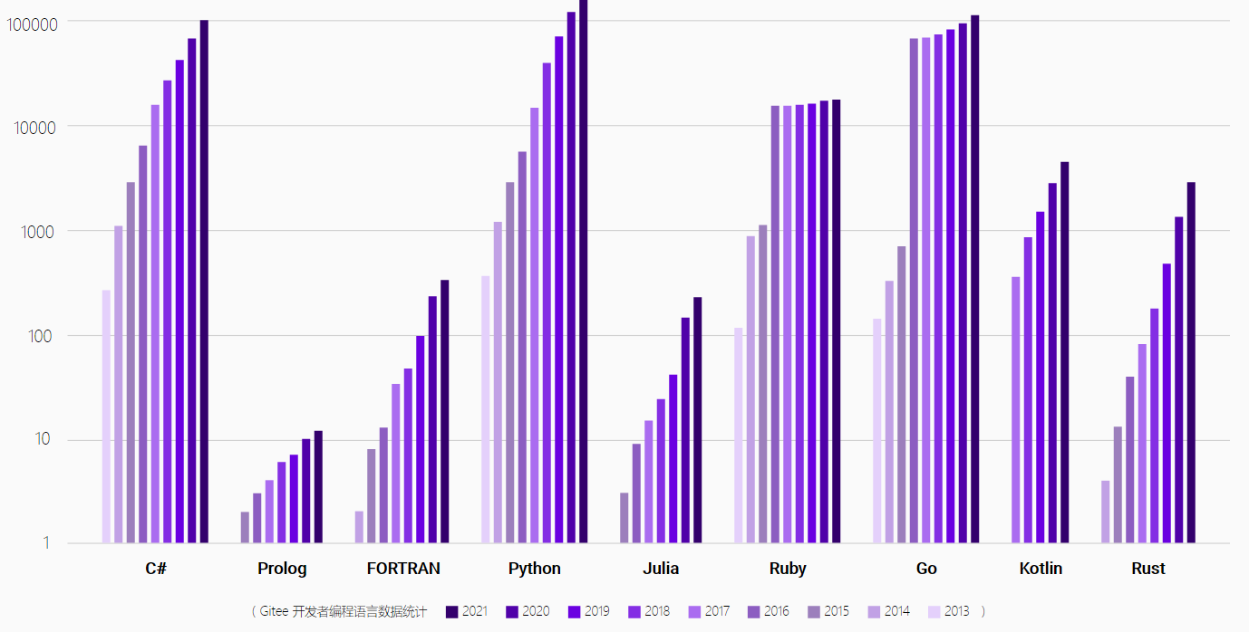 在 Gitee 2021 年所有新增仓库使用的语言中,Erlang 以 226.85% 的增长率排在的第一位。同时,Rust 连续三年保持高速增长,增长率均超过 110%,值得一提的是,今年 Rust 语言终于有了自己的基金会,在华为、微软与谷歌等大企业进一步的推动下,相信 Rust 将持续突破。2021 年基础软件在国内热度持续走高,Verilog 也连续两年出现在了增速最快语言榜单中。作为前端领域热度逐年增多的语言,TypeScript 连续三年入选增速最快语言,其在 Gitee 所有仓库中采用语言的占比也在逐年上升,2021 年已经来到了第 13 位。
