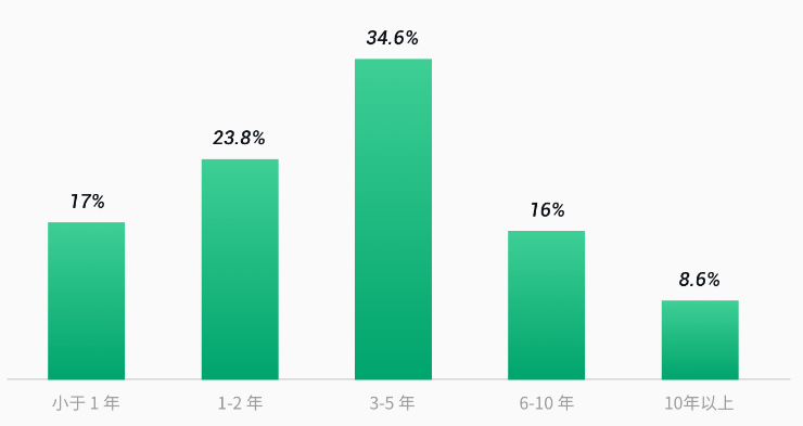 开源在国内流行实际上时间不算长,超过 70% 的开发者参与开源时间在 5 年以下,但有 8.6% 的受访者接触开源时间超过 10 年,这个结果还是出乎意料的。