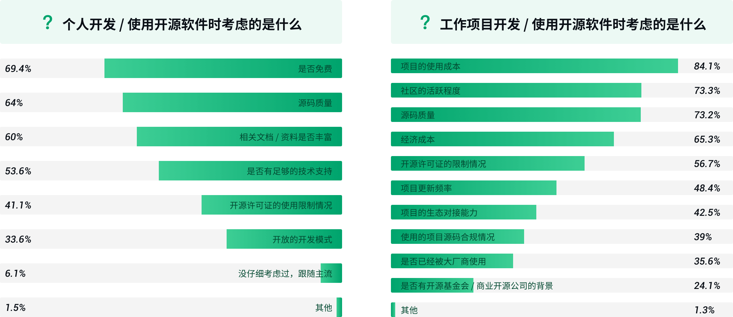 项目的使用成本、源代码质量以及社区是否足够活跃和健康是企业使用开源软件时最关心的,而经济成本的考虑只排在了第四位。同时,企业在选择开源软件时,会更多地考虑软件对自身的适用性,不会过分迷信“大厂光环”、开源基金会或商业开源公司。